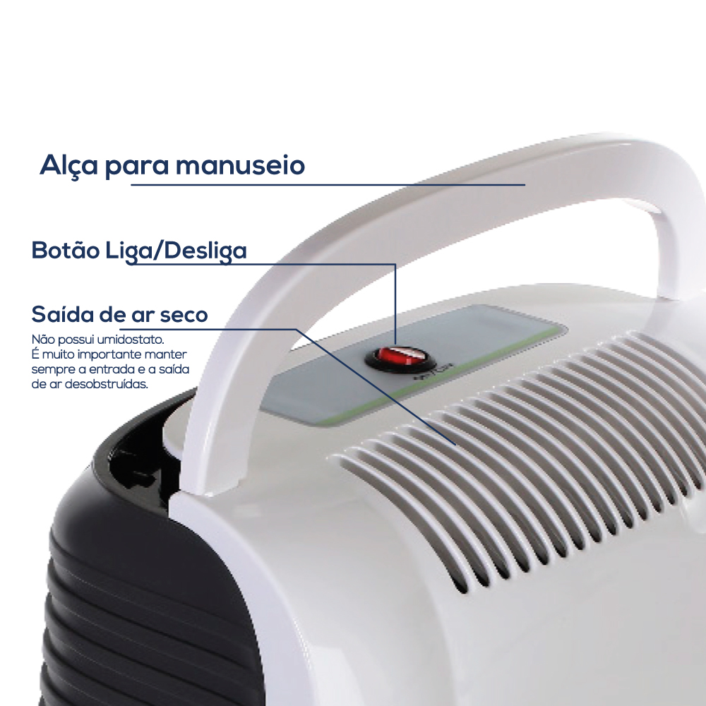 - Desumidificação (Litros/dia): 10L/D 30°C 80%UR